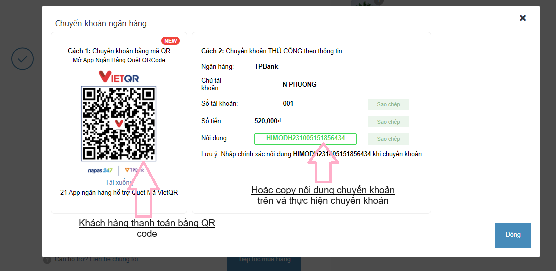 Bước 5: Khách hàng thanh toán đơn hàng bằng quét QR code or copy nội dung chuyển khoản và thực hiện chuyển khoản qua ngân hàng